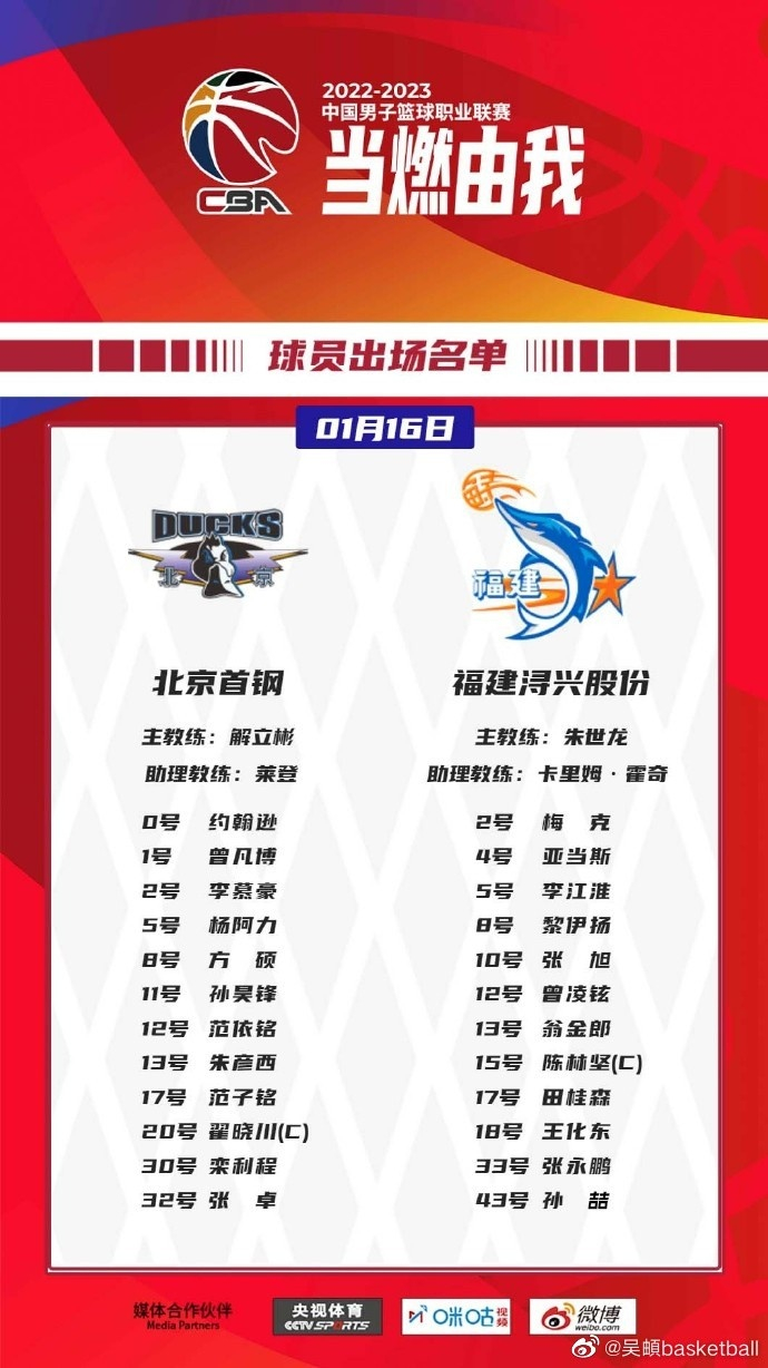 直播吧1月16日讯 CBA常规赛,北京稍后将对阵20:00福建。