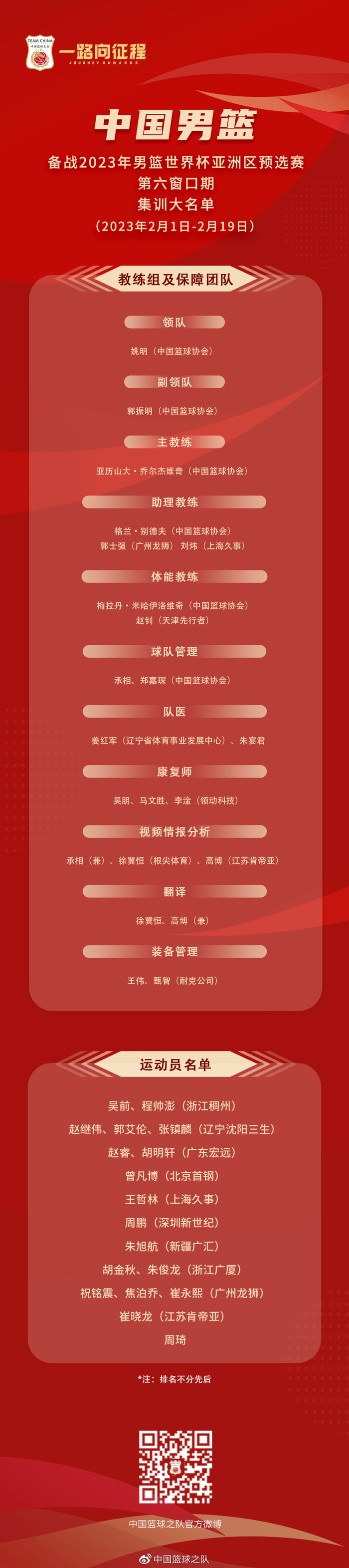 今日,中国篮协公布了中国男篮18人集训大名单。具体如下: