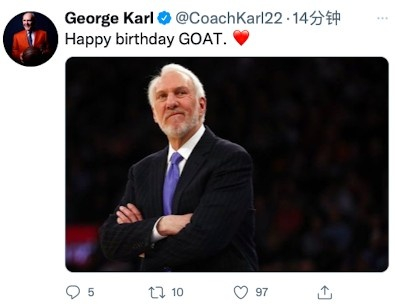 前NBA名帅乔治-卡尔发推祝波波生日快乐,他写道:“生日快乐,GOAT(历史最佳)❤️”