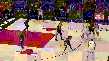 相比之前的5连胜——最铁的一场三分命中率也有42.9%——这场比赛传递的信号更有意思一些。公牛在持球人进入三分线以后给的压力是比较足的,正面往里突并不容易,对球施压配合多点积极协防算是公牛的一个特点。快船因此不断向弧顶出球,出手了比平时更多的三分球。这种情况在未来还会遇到,说到底是因为快船内外连线、强弱侧连线,用传球直接打到篮下和弱侧底角的能力有限,也就变向提升了对上提、外切射手能力的考验,而巴图姆和肯纳德并没有很好地完成任务。