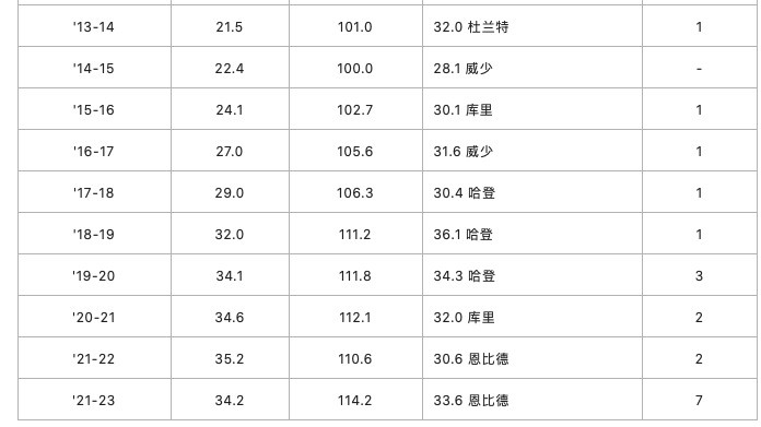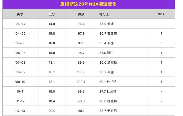 我下面列了詹姆斯经历的这20个赛季,你可以看出三分球数量成倍增加,平均得分提升了20.8分,然而看得分第一的球星,无论平均得分,还是赛季平均达到30+的球员数量,都没有明显变化。在前16个赛季中,有15个赛季仅一位球员平均得分30+,甚至没有。今年到目前为止,有7名球员平均30+,但最高的恩比德也只有33.6分,因为赛季还没有打完,最后可能有4人左右保持30+。