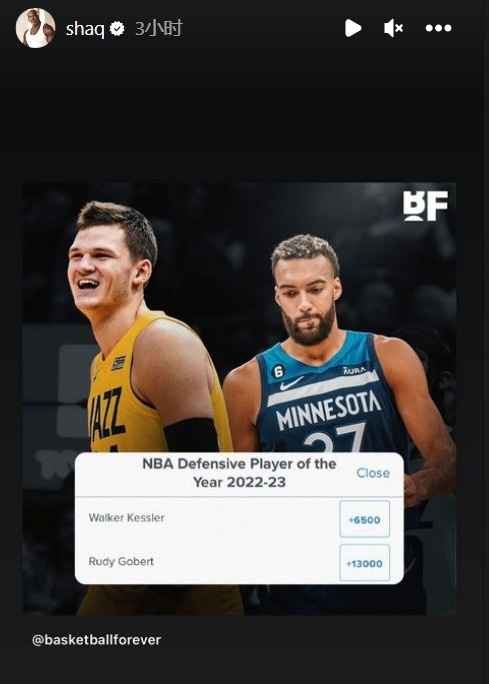 奥尼尔晒凯斯勒与戈贝尔DPOY赔率对比 前者大幅领先👀