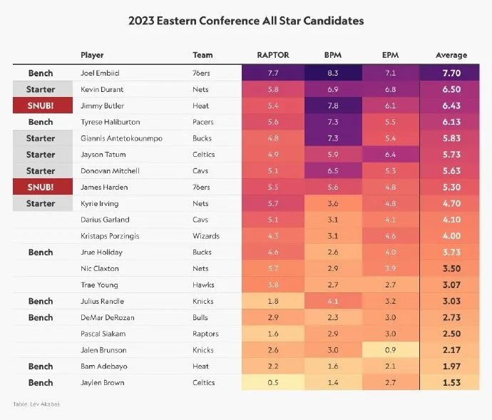 高阶数据上,国外有博主统计了目前应用最广泛的raptor,epm,bpm三项数据的平均值,从表格中可以看出,哈登比很多入选全明星的球员都要高。