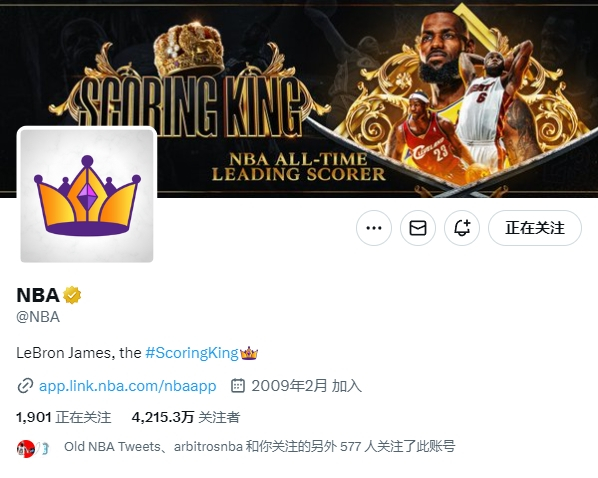 牌面拉满!NBA官推头像更新为王冠 简介是“詹姆斯—历史得分王”