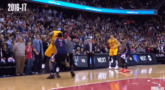16-17赛季对阵奇才 绝境詹!詹姆斯接乐福四分卫长传,面对比尔完成翻身后仰三分,完成绝平!