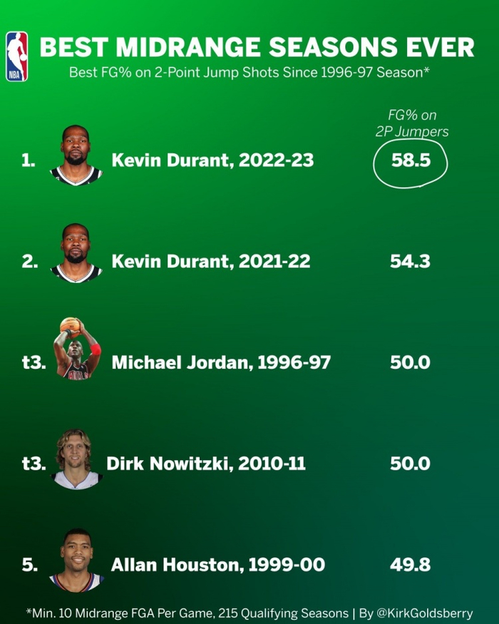 直播吧2月9日讯 今天杜兰特被交易到太阳。数据分析师Kirk Goldsberry晒出历史单赛季中距离命中率排行榜。