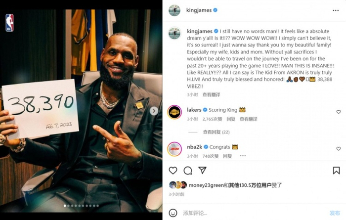 直播吧2月10日讯 今日詹姆斯更新Ins谈到了成为历史得分王的感受。