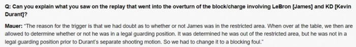 赛后当值裁判也对此次判罚进行了详细的解释:“在杜兰特被吹罚进攻犯规后,三位裁判当时不确定詹姆斯是否位于合理冲撞区内。通过查看录像回放之后,裁判确认了詹姆斯是处于合理冲撞区之外的(这一点毋庸置疑)。但裁判同时也重审了詹姆斯是否处于合理的防守位置,但回放显示詹姆斯并没有处于合理的防守位置,因为当两人产生身体接触时,詹姆斯侧着身子并且还在向杜兰特的方向移动(主要争论点),所以裁判最终改判詹姆斯防守犯规。”