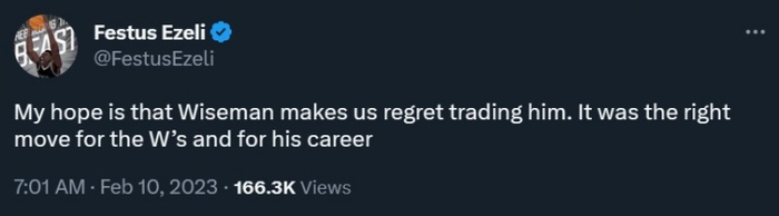 对此,前NBA球员埃泽利发推写道:我希望怀斯曼能让我们后悔把他交易走,这对于怀斯曼的生涯和勇士来说,都是一个正确的决定。