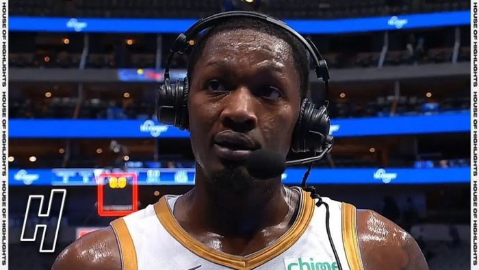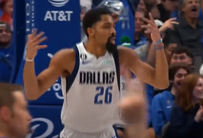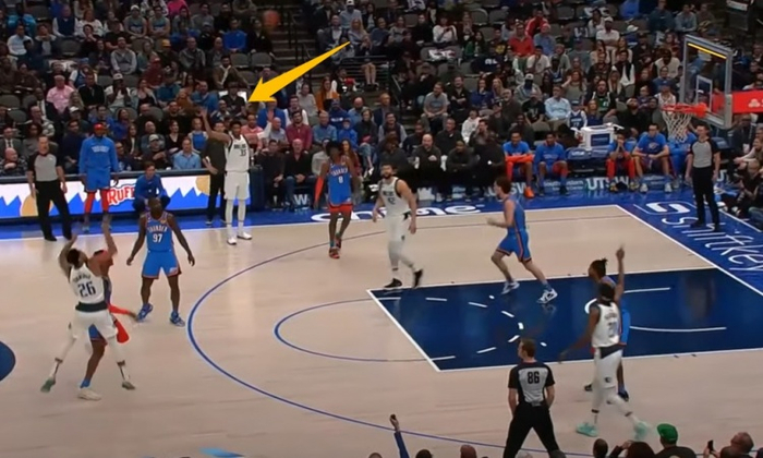 克里斯蒂安-伍德有些不好意思地举起右臂,看向斯宾塞-丁威迪。他刚为后者传出一记三分助攻,这球将独行侠第四节的领先优势扩大到两位数。