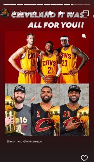 詹姆斯转发骑士三巨头夺冠合照:克利夫兰 这一切都是为了你