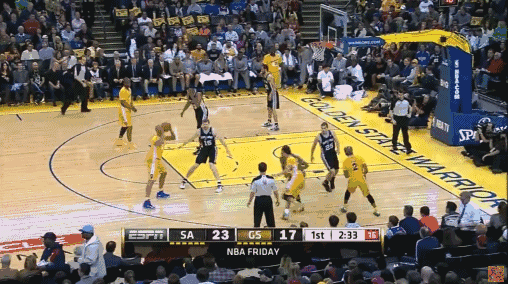 在上图这个掩护中,追防库里的球员选择从电梯门的“外侧”追防,因此勇士的“关门”并没有起到明显作用