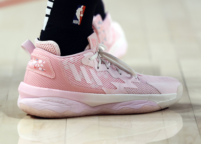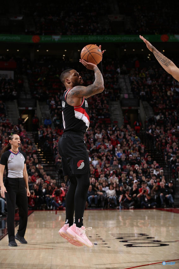 利拉德上脚个人第8代签名鞋‘樱花’配色战靴