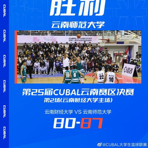 直播吧3月4日讯 CUBAL一级联赛,云南师范大学87-80击败云南财经大学,夺得云南赛区冠军。