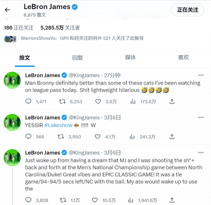 直播吧3月7日讯 湖人球星勒布朗-詹姆斯今日发推。