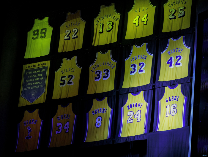 传奇解说员奇克-赫恩、明尼阿波利斯湖人白色99号乔治-麦肯、22号埃尔金-贝勒、13号张伯伦、44号杰里-韦斯特、25号盖尔-古德里奇、52号贾马尔-威尔克斯、33号贾巴尔、32号魔术师约翰逊、42号詹姆斯-沃西、34号奥尼尔、8号&24号科比-布莱恩特,这些人都是湖人队史的传奇人物,除了解说员奇克-赫恩和“无冕之王”贝勒爷,其他人大多数都是队史各年代夺冠的核心球星。
