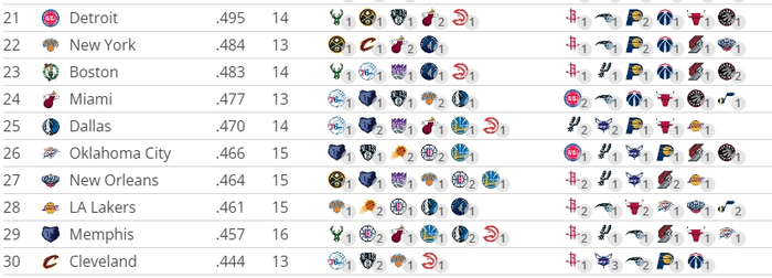21-30名的对手胜率都在五成以下,其中湖人赛程难度排名第28,对手胜率只有46.1%,对于冲刺季后赛的他们来说是重大的利好消息,15场比赛中艰难对阵只有5场,赛程最简单的是骑士,他们对手胜率44.4%,13场比赛中艰难对阵只有4场。