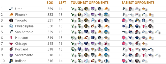 太阳、猛龙、76人的赛程难度也不容小觑,马刺和火箭分列5、6,不过他们没有战绩压力,公牛、开拓者、国王、步行者分列7-10名。