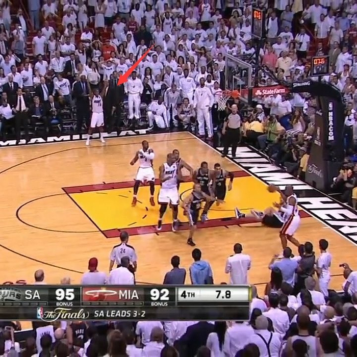 当时比赛还剩最后19.4秒,热火落后3分,詹姆斯三分不中,波什抢下关键前场篮板,随后将球交给阿伦,后者在接球时顺势撤出三分线,随后拔起命中了NBA历史上最关键的三分之一,帮助热火在总决赛G6里将比赛拖入了加时,最终103-100加时战胜马刺。