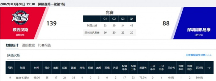 直播吧3月20日讯 2002年3月20日,保级赛第一轮G1,陕西队(现广州龙狮)139-88轻取深圳润讯队。