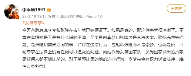 昨日,澳大利亚足球超级联赛跟队记者李平康发文写道:“今天有消息说李梦和张隆在去年就已经领证了。如果是真的,那这件事就很清晰了。不管在离婚前是不是有什么暧昧不清,至少目前李梦和张隆才是合法夫妻。而抚养费等问题,是张隆和前妻之间的事,若存在违法行为,应起诉张隆而不是李梦。也就是说,目前李梦在法律上没有任何可以追究的问题,而她作为女篮国家队一员为国家做出的贡献是任何人都不能抹杀的,对于羞辱抹黑的她的这些行为,李梦完全有权力诉诸法律,维护自身利益!”