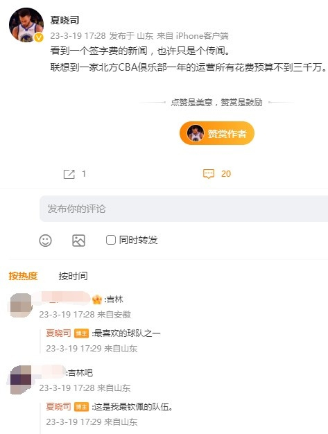 夏晓司写道:“看到一个签字费的新闻,也许只是个传闻。联想到一家北方CBA俱乐部一年的运营所有花费预算不到三千万。”