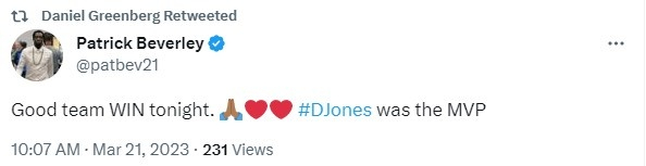 赛后,公牛后卫贝弗利发推写道:“今晚是一场很棒的团队胜利。 🙏🏾❤️❤️小德里克-琼斯是MVP。”