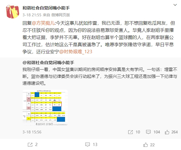 随后,付政浩又在回复网友评论时写道:“今天这事儿犹如炸雷,我已无语,恕不想回复吃瓜网友,但忍不住驳斥你的观点,因为你的说法容易激怒受害人。毕竟人家赵姐手里攥着大把证据,李梦并不无辜。好在赵姐也算半个篮球圈的人,在两家联赛公司工作过,估计她这么干是真被逼急了。唯愿李梦张隆信守承诺,早日平息争议,还行业安宁。”