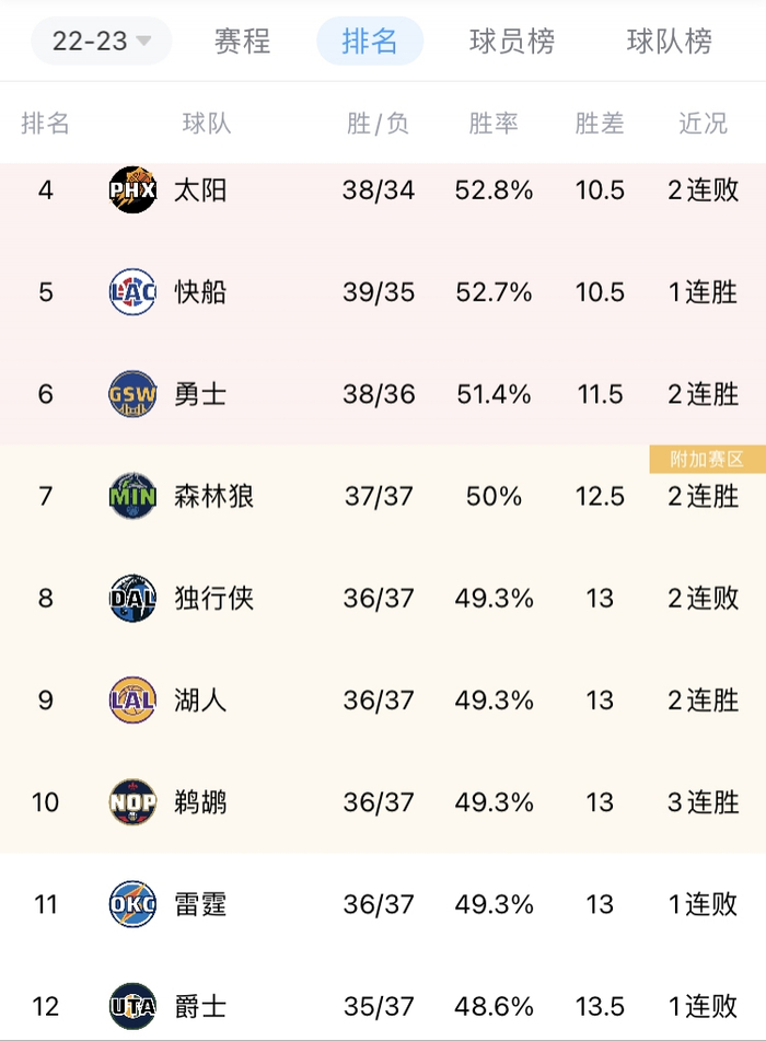 西部再次出现4支球队战绩相同的情况,而且从第4名的太阳开始,到第12名的爵士,胜场差也只有3个而已。