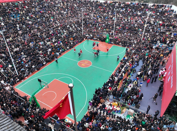从现场无人机拍摄的照片来看,球场两侧的看台,高耸如危崖,上边密密麻麻挤满了人,现场氛围感也不亚于NBA。而球场不远处,还能看到蜿蜒崎岖的丘陵地貌,有水塘、农田和山丘,台盘村就顺着地势优雅地铺展在河谷当中。