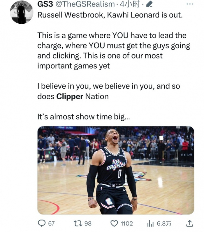 @GS3:致威少:今天小卡缺阵了,这是一场赛需要你站出来承担责任的比赛,是一场需要你带领大家前进、让队友发挥的比赛,也是至今最重要的比赛之一。我相信你,大家相信你,整个快船球迷群体都相信你!!你也没有让大家失望,带来了一场伟大的表演!!!