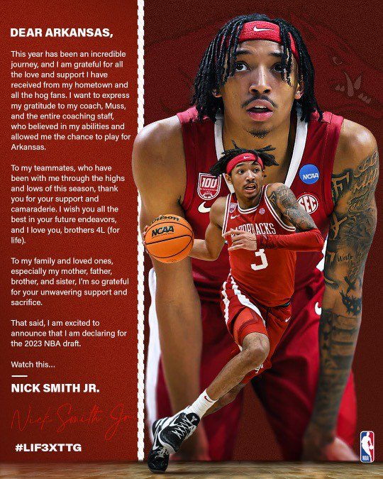 直播吧3月30日讯 阿肯色大学后卫小尼克-史密斯自宣参加2023年NBA选秀。