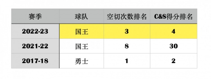 所以你也能看得到,国王队利用空切终结进攻的次数从上赛季的联盟第8上升到了联盟第3;而每次空切得分从1.28分提升到了1.34分,虽然是微小的提升,但这个事情就像高考一样,一点点分数就能刷掉一大批人了。