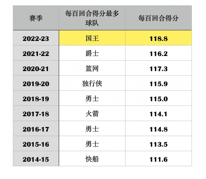 我们常说有杜兰特、哈登、欧文的篮网是历史第一进攻大队,但实际上,本赛季的国王似乎更担得起这份名号——他们已经是自ABA和NBA合并以来单赛季场均得分最高的球队了。