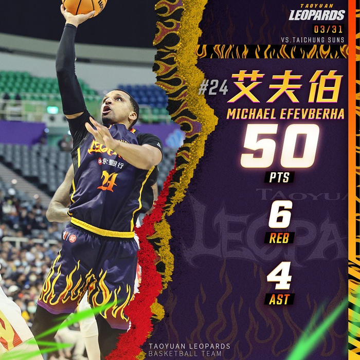 直播吧4月1日讯 昨日进行的T1联赛常规赛,桃园云豹今天在主场迎战台中太阳,虽然菲巴(台译艾夫伯)拿下个人T1生涯单场新高50分,但云豹本土球员熄火,最终97比101遭遇连败,太阳则终止8连败。
