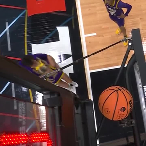 今日进行的NCAA女篮最终四强战,路易斯安那州立大学啦啦队使出高难度托举动作,将卡在篮板上沿的篮球轻松拿下。