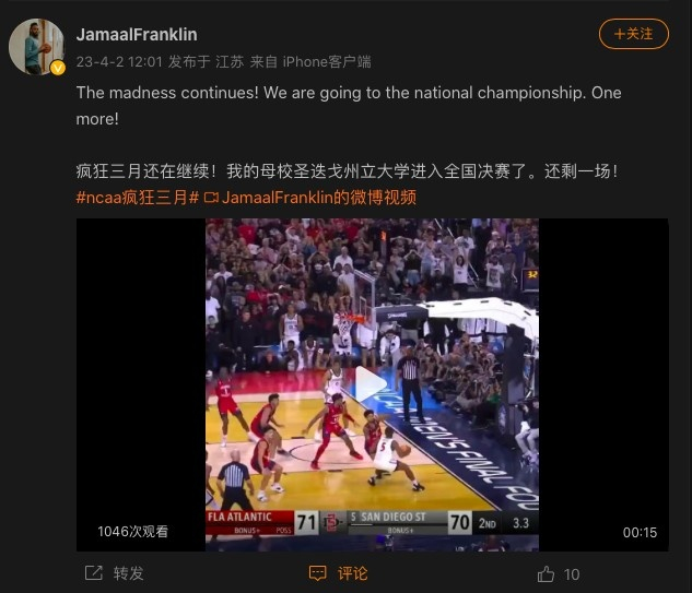 前CBA上海队外援贾马尔-富兰克林更新社媒庆祝母校队史首次闯进NCAA决赛,他写道:“疯狂三月还在继续!我的母校圣迭戈州立大学进入全国决赛了。还剩一场!”