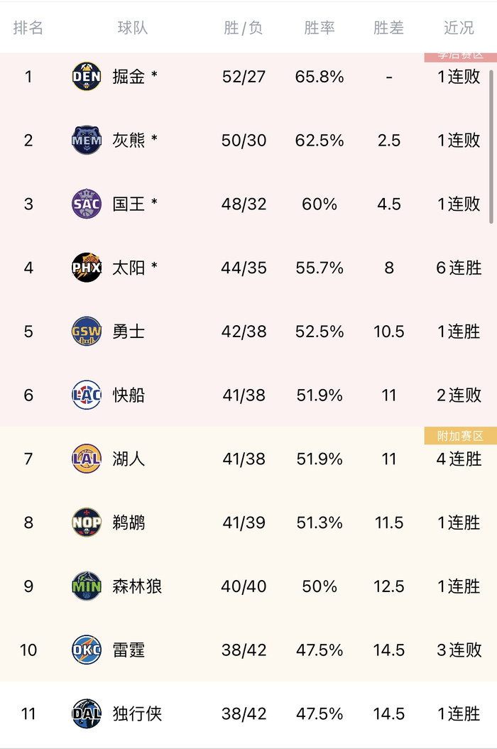 目前,雷霆排在西部第十,独行侠排在西部第十一。在剩余的两场比赛中,独行侠只有在比雷霆多赢一场的情况下,才能够反超至第十。