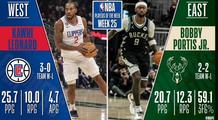 直播吧4月11日讯 NBA官方今日公布了上周东西部最佳球员得主,快船球星莱昂纳德、雄鹿前锋波蒂斯分别当选。