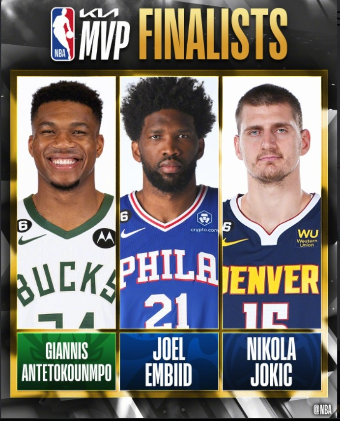 其实出现这三人候选MVP奖也是近几年的事儿。早先在字母哥当选MVP的2018-19和2019-20赛季,MVP三人候选除了字母哥之外,先后是哈登、保罗-乔治和詹姆斯等人。等到了2020-21赛季,约基奇当选MVP,三人中除了他和恩比德,还有个库里维护着联盟小个子们的尊严。待到了2021-22赛季,MVP便成了他们三人行。