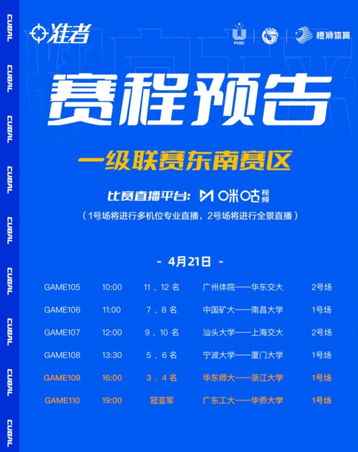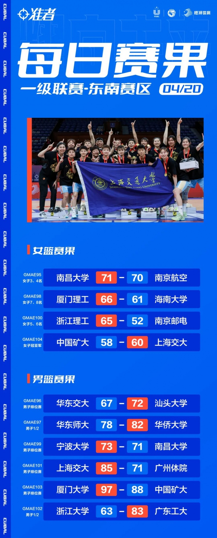 4月20日,CUBAL东南赛区倒数第二个比赛。今日女篮举行了决赛,上海交大女篮以60:58战胜中国矿大,夺得东南王!中国矿大夺得东南亚军;南昌大学女篮准绝杀南京航空,夺得东南季军。男篮方面,华侨大学最后时段四罚全中战胜华东师大,时隔五年重回东南决赛;广东工大战胜浙江大学,晋级东南决赛。明日广东工大vs华侨大学,谁是东南王?