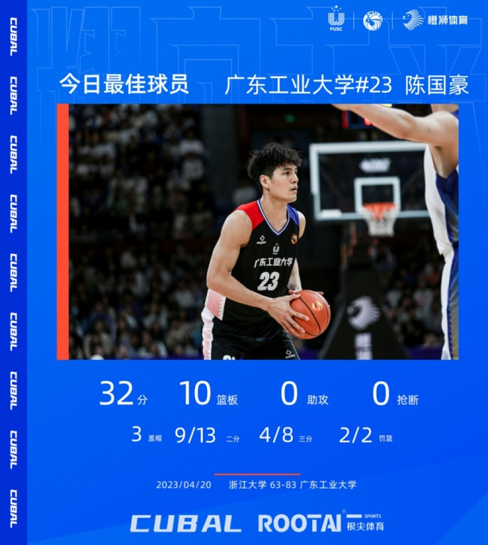 今日最佳球员属于广东工业大学23号陈国豪,他在对阵浙江大学的比赛中拿下32分10篮板3盖帽,在上半场一度落后的情况下带领球队战胜对手,并挺进东南决赛!