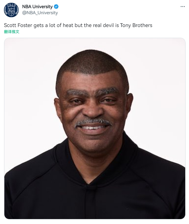 分析研究NBA数据的专业媒体NBA University发文怒喷:“尽管很多人都很讨厌斯科特-福斯特(Scott Foster),但真正的魔鬼是托尼-布拉泽斯(Tony Brothers)。”