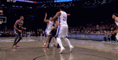 那是在比赛刚刚开始没多久,篮网一次攻守转换,克拉克斯顿空中接力半隔扣恩比德,恩比德从空中倒地,克拉克斯顿试图从他的身上跨过去,躺在地上的恩比德怒不可遏,抬起左腿踢到了克拉克斯顿的后裆部。