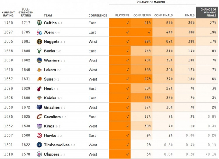 勇士的晋级概率由此前的61%涨至70%,夺冠概率为7%;国王的晋级概率由39%降为30%,夺冠概率为0.3%。