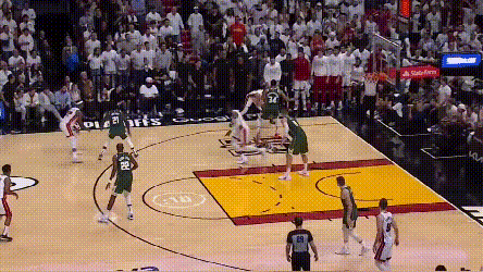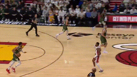 字母回归,再次确立了雄鹿的内线优势。G3热火能赢,除了暴走的三分手感,还有乐福带来的X因素。热火把他放在首发对位大洛,遏制住了大洛仰仗高度的终结优势,又在衔接段扮演空间5号位,牵制了大洛的护筐,拆去了雄鹿之于热火的最大优势。字母的回归改变了形势,一来字母本就是全联盟正面捶筐最具侵略性的肉身之一,二来字母可以在攻防两端激活或修正大洛的优势与劣势,进而将油漆区高度优势再次把握在雄鹿手里。有这些画面可以作为佐证: