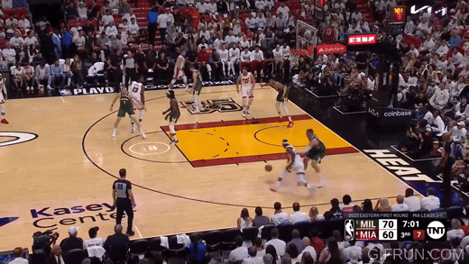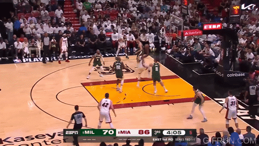 甚至还有离谱的以一个外围球员,独自持球,单挑雄鹿双塔——还进了。