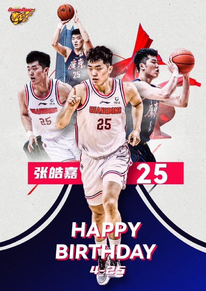 直播吧4月25日讯 今天是广东男篮球员张皓嘉的23岁生日,广东队发文为其送上生日祝福。