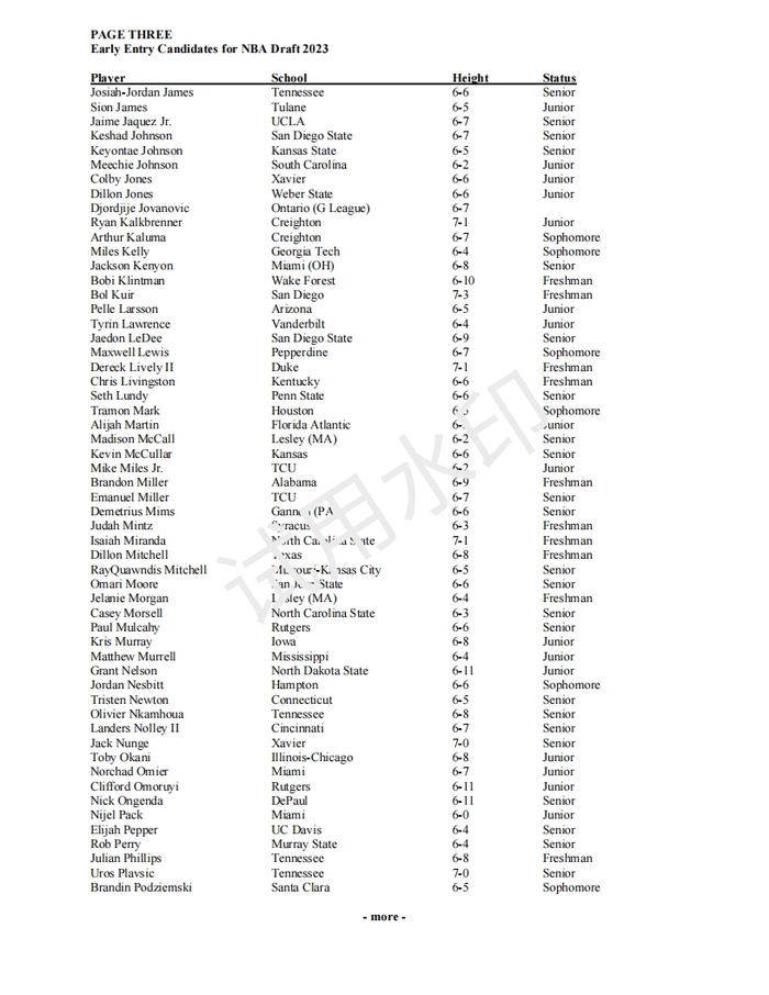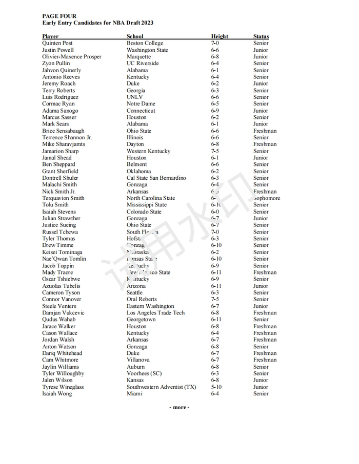 直播吧4月26日讯 NBA官方宣布,已有242名球员申请参加2023年NBA选秀,以下为完整球员名单。