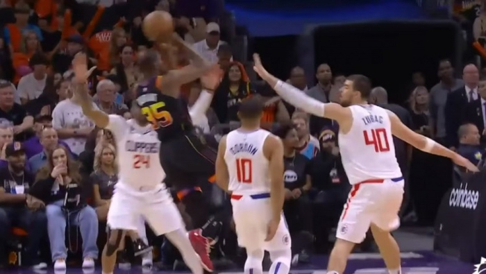 杜兰特在左底角拉空,布克叫牛角位双掩护,一个摆脱中投。